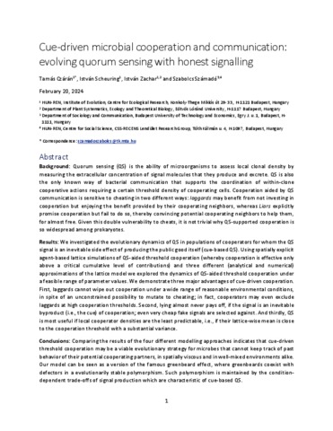 Czárán, Tamás and Scheuring, István and Zachar, István and Számadó, Szabolcs (2024) Cue-driven microbial cooperation and communication: evolving quorum sensing with honest signaling. BMC BIOLOGY, 22 (1). No. 73. ISSN 1741-7007