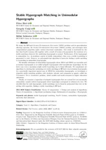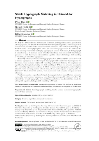 Biró, Péter and Csáji, Gergely Kál and Schlotter, Ildikó Anna (2025) Stable Hypergraph Matching in Unimodular Hypergraphs. In: 52nd International Colloquium on Automata, Languages, and Programming (ICALP 2025). Leibniz International Proceedings in Informatics, LIPIcs (334). Schloss Dagstuhl Leibniz-Zentrum für Informatik, Saarbrücken, Wadern, 31:1-31:20. ISBN 9783959773720