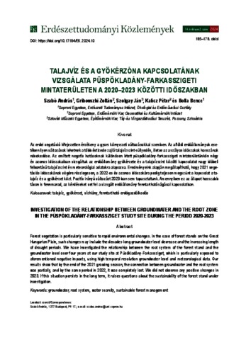 Az erdei vegetáció kifejezetten érzékeny a gyors környezeti változásokkal szemben. Az alföldi erdőállományok esetében ilyen változások lehetnek a több évtizede zajló talajvízszint-süllyedés, illetve az aszályos időszakok hosszánaknövekedése. Az említett negatív hatásoknak különösen kitett püspökladány-farkasszigeti mintaterületünkön négyév azonos időszakaiban vizsgáltuk az erdőállomány gyökérzete és a talajvízszint közötti kapcsolatot nagy időbelifelbontású talajvízszint és meteorológiai adatokra alapozva. Eredményeink alapján megállapítható, hogy 2021 vegetációs időszakának végére részlegesen, a 2022-es év azonos időszakára pedig teljesen megszűnt a kapcsolat a talajvíz és a gyökérzet közt. Pozitív irányú változást 2023-ban sem tapasztaltunk. Amennyiben ez az állapot hosszabbtávon is fennmarad, az kérdéseket vet fel a vizsgált erdőállomány fenntarthatóságával kapcsolatban.