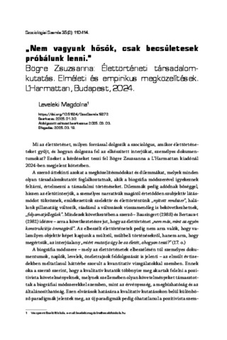 Kaszásné Leveleki, Magdolna (2025) „Nem vagyunk hősök, csak becsületesek próbálunk lenni.” Bögre Zsuzsanna: Élettörténeti társadalomkutatás. Elméleti és empirikus megközelítések. L’Harmattan, Budapest, 2024. SZOCIOLÓGIAI SZEMLE, 35 (2). pp. 110-114. ISSN 1216-2051