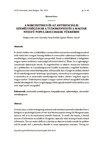 Selyem, Anna (2025) A nárcisztikus és az antiszociális személyiségzavar a tudományos és a magyar nyelvű populáris cikkek tükrében. ACTA UNIVERSITATIS DE CAROLO ESZTERHÁZY NOMINATAE. SECTIO BIOLOGIAE / AZ ESZTERHÁZY KÁROLY EGYETEM TUDOMÁNYOS KÖZLEMÉNYEI. TANULMÁNYOK A BIOLÓGIAI TUDOMÁNYOK KÖRÉBŐL, 49. pp. 35-66. ISSN 2732-0480