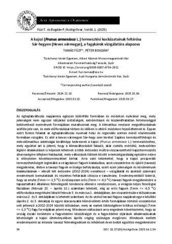 Füzi, Tamás and Bogdán, Péter (2025) A kajszi (Prunus armeniaca L.) termesztési kockázatainak feltárása Sár-hegyen (Heves vármegye), a fagykárok vizsgálatára alapozva. ACTA AGRONOMICA ÓVÁRIENSIS, 66 (1). pp. 54-68. ISSN 1416-647X