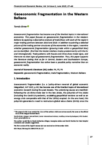 Ginter, Tamás (2025) Geoeconomic Fragmentation in the Western Balkans. FINANCIAL AND ECONOMIC REVIEW, 24 (2). pp. 27-46. ISSN 2415-9271