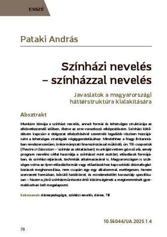 Pataki, András (2025) Színházi nevelés – színházzal nevelés : Javaslatok a magyarországi háttérstruktúra kialakítására. URÁNIA: INTERDISZCIPLINÁRIS FOLYÓIRAT : SZÍNHÁZ MOZGÓKÉP MÉDIA, 5 (1). pp. 78-117. ISSN 2786-3255