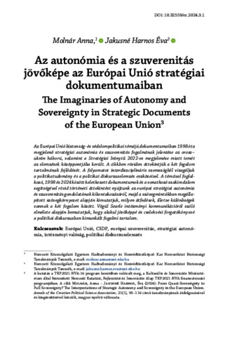 Molnár, Anna and Jakusné Harnos, Éva (2024) Az autonómia és a szuverenitás jövőképe az Európai Unió stratégiai dokumentumaiban. EURÓPAI TÜKÖR: AZ INTEGRÁCIÓS STRATÉGIAI MUNKACSOPORT KÉTHAVONTA MEGJELENŐ FOLYÓIRATA, 27 (3). pp. 7-27. ISSN 1416-6151
