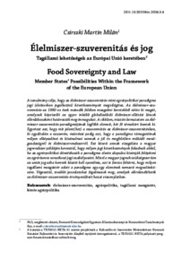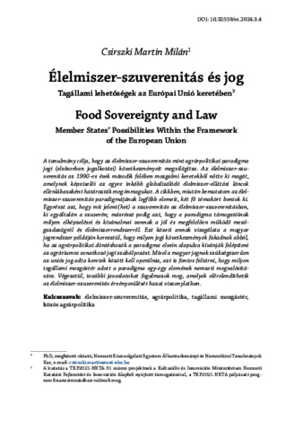 A tanulmány célja, hogy az élelmiszer-szuverenitás mint agrárpolitikai paradigma jogi (elsősorban jogalkotási) következményeit megvilágítsa. Az élelmiszer-szuverenitás az 1990-esévek második felében mozgalmi keretekből nőtte ki magát, amelynek képviselői az egyre inkább globalizálódó élelmiszer-ellátási láncok ellenlábasaként határozták meg önmagukat. A cikkben, miután bemutatom az élelmiszer-szuverenitás paradigmájának legfőbb elemeit, két fő témakört bontok ki. Egyrészt azt, hogy mit jelent(het) a szuverenitás az élelmiszer-szuverenitásban, ki egyáltalán a szuverén; másrészt pedig azt, hogy a paradigma támogatóinak milyen elképzelései és kívánalmai vannak a jól és megfelelően működő mezőgazdaságról és élelmiszerrendszerről. Ezt követi annak vizsgálata a magyar jogrendszer példáján keresztül, hogy milyen jogi következmények fakadnak abból, ha az agrárpolitikai döntéshozók a paradigma elvein alapulva kívánják felépíteni az agráriumra vonatkozó jogi szabályozást. Mivel a magyar jognak szükségszerűen az uniós jog adta keretek között kell operálnia, azt is fontos feltárni, hogy milyen tagállami mozgástér adott a paradigma egy-egy elemének nemzeti megvalósítására. Végezetül, további javaslatokat fogalmazok meg, amelyek előrelendíthetik az élelmiszer-szuverenitás érvényesülését hazai viszonylatban.