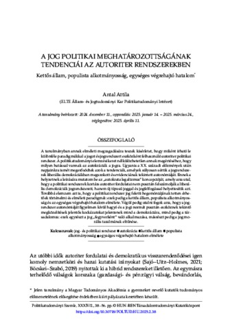 Antal, Attila (2025) A jog politikai meghatározottságának tendenciái az autoriter rendszerekben. Kettős állam, populista alkotmányosság, egységes végrehajtó hatalom. POLITIKATUDOMÁNYI SZEMLE, 34 (2). pp. 38-56. ISSN 1216-1438