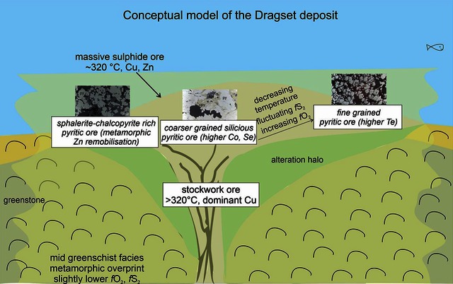 The Dragset deposit, central Norway, is a mafic (former Cyprus-type) volcanogenic massive sulphide (VMS) deposit hosted within oceanic back-arc affinity metavolcanic rocks of the Early Ordovician Løkken Ophiolite. During the Caledonian orogeny, the Dragset deposit was deformed and metamorphosed in lower-mid greenschist facies, which lead to a local segmentation of the deposit. To study the genesis of Dragset and assess its critical metal potential, field observations, optical and electron microscopical petrography, in situ mineral chemistry (EPMA and LA-ICP-MS) and whole-rock geochemical analyses were performed. This study reveals that the chemistry of pyrite, pyrrhotite and chalcopyrite can be used to determine the temperature, oxygen- and sulphur fugacity conditions at which the sulphide ore formed, despite the low-mid greenschist metamorphic overprint. High formation temperatures (>320 °C in feeder zone and ∼320 °C in massive sulphide lens) facilitated Co-enrichment in pyrite from the massive sulphide ore body and led to the formation of cobaltite. Percolating fluids became progressively more oxidised towards the seafloor due to mixing with oxygenated seawater. This process led to strong Te-enrichment of pyrite and the appearance of Te-mineral inclusions in pyrite. The metamorphic overprint did not cause Au-leaching from pyrite but rather led to high temperature (320–480 °C) Zn remobilisation and precipitation of sphalerite-bearing ore in permeable zones of the deposit. Our results highlight the occurrence of critical metals enrichments and detail their distribution within the VMS system of Dragset.