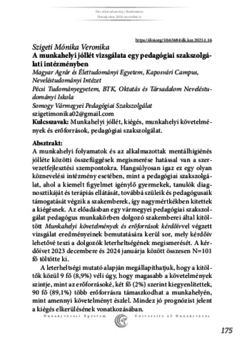 Szigeti, Mónika Veronika (2025) A munkahelyi jóllét vizsgálata egy pedagógiai szakszolgálati intézményben. DUNAKAVICS, 13 (1 ksz.). pp. 175-183. ISSN 2064-5007