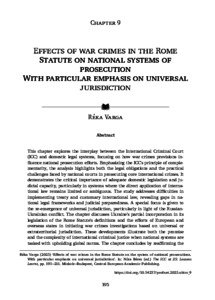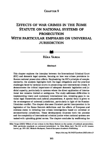 Varga, Réka (2025) Effects of war crimes in the Rome Statute on the system of national prosecutions : With particular emphasis on universal jurisdiction. In: The ICC at 25: Lessons Learnt. Studies Of The Central European Professors’ Network . Central European Academic Publishing, Miskolc–Budapest, pp. 195-211. ISBN 9786156474964