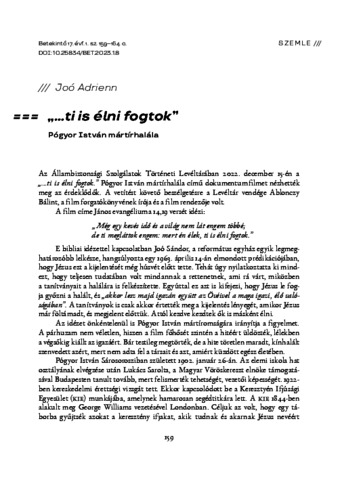 Joó, Adrienn (2023) „…ti is élni fogtok” : Pógyor István mártírhalála. BETEKINTŐ, 17 (1). pp. 159-164. ISSN 2732-186X
