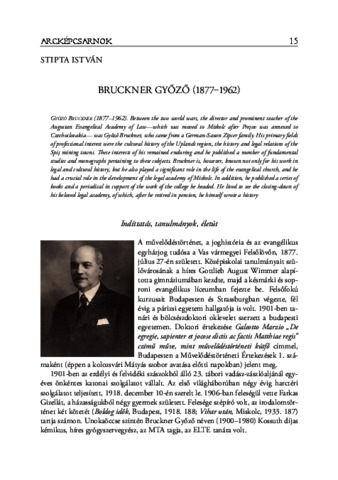 G yőző B ruckner (1877–1962). Between the two world wars, the director and prominent teacher of the Augustan Evangelical Academy of Law—which was moved to Miskolc after Preşov was annexed to Czechoslovakia— was Győző Bruckner, who came from a German-Saxon Zipser family. His primary fields of professional interest were the cultural history of the Uplands region, the history and legal relations of the Spiş mining towns. These interests of his remained enduring and he published a number of fundamental studies and monographs pertaining to these subjects. Bruckner is, however, known not only for his work in legal and cultural history, but he also played a significant role in the life of the evangelical church, and he had a crucial role in the development of the legal academy of Miskolc. In addition, he published a series of books and a periodical in support of the work of the college he headed. He lived to see the closing-down of his beloved legal academy, of which, after he retired in pension, he himself wrote a history.