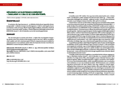 E tanulmány célja, hogy bemutassa és – az időközben bekövetkezett jogszabályváltozás szempontjából – értékelje az Európai Unió Bíróságának a C-286/22. számú ügyben hozott azon döntését, amely szerint egy 20km/h végsebességgel rendelkező, mechanikus erőn kívül izomerőt is hasznosító pedelec kerékpár, a kötelező gépjármű-felelősségbiztosításról szóló 2009/103/EK irányelv 1. cikk (1) bekezdése szerint nem minősül gépjárműnek.