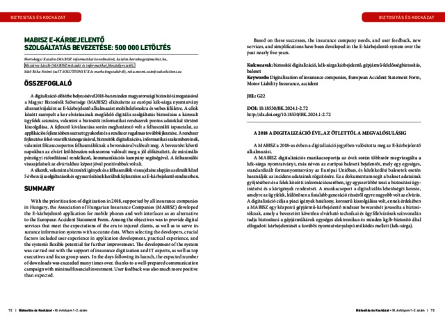 Hortobágyi, Katalin and Mészáros, László and Sütő, Réka Noémi (2024) MABISZ e-kárbejelentő szolgáltatás bevezetése: 500 000 letöltés. BIZTOSÍTÁS ÉS KOCKÁZAT, 11 (1-2). pp. 72-91. ISSN 2064-9584