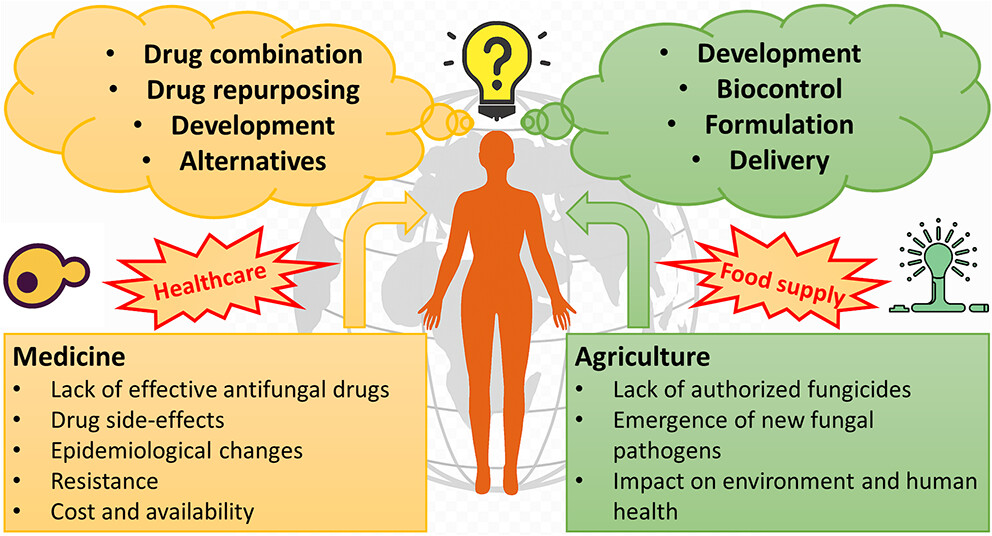 The prevalence of fungal infections and contamination has increased alarmingly over the past decade, posing a significant threat to human health and the food supply and negatively affecting welfare. This escalating concern is primarily attributed to the lack of safe, effective, and widely available antifungal agents; the increasing spread of (multi)drug resistance to conventional antifungal treatments; and substantial epidemiological shifts in fungal pathogens. Decision-making bodies have recognized the urgency of this situation and prioritized efforts to address and mitigate the spread of drug-resistant fungal infections by developing and implementing innovative antifungal strategies, including using drug combinations, designing fundamentally new antifungal compounds with fungus-specific mechanisms of action and a minimal risk of resistance development, drug repurposing, and exploring alternative approaches, such as biomolecules, nanotechnology, and biological control. This review aims to provide a comprehensive overview of the current challenges associated with fungal infections in medicine and agriculture as well as the latest advancements and potential solutions.