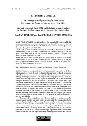Turečková, Kamila and Duda, Danuta and Buryová, Ivona (2025) The divergence of paternity leave across EU countries is surprising: a study for 2023 = Meglepő eltérések az apasági szabályozás intézményében az Európai Unió országai között: egy 2023-as tanulmány. TÉR ÉS TÁRSADALOM, 39 (2). pp. 111-135. ISSN 0237-7683