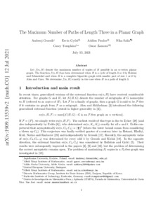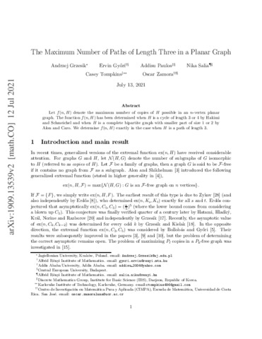 Győri, Ervin and Addisu, Paulos and Salia, Nika and Tompkins, Casey and Zamora, O. (2021) The Maximum Number of Paths of Length Three in a Planar Graph. In: Trends in Mathematics. Trends in Mathematics (14). Springer Science and Business Media Deutschland GmbH, pp. 262-266.