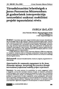 A tanulmány egy hazai, megyei hatókörű városi múzeum társadalmasítási lehetőségeit tárja fel egy Erasmus+ szakmai mobilitási program révén, melynek során múzeumi szakemberek külföldi partnerintézmények gyakorlatából tanulhattak. A job shadowing, mint nonformális tanulási módszer, lehetőséget biztosított arra, hogy közvetlen tapasztalatszerzés útján, aktív részvétellel és szakmai mentorálással ismerkedjenek meg innovatív, közösségépítő múzeumi gyakorlatokkal, amelyek hazai környezetbe való adaptálása jelentős előrelépést jelenthet a múzeumpedagógiai gyakorlat fejlesztésében.A leírás részletesen elemzi a Janus Pannonius Múzeum (JPM) által megvalósított projektet, amelynek során az intézmény szakemberei Európa-szerte inspiráló múzeumi programokat látogattak meg, különös tekintettel az inkluzív és közösségi részvételi gyakorlatokra. | This study explores the possibilities for social engagement within a Hungarian, county-level municipal museum through an Erasmus+ professional mobility program, which enabled museum professionals to learn from the practices of partner institutions abroad. Job shadowing, as a non-formal learning method, provided the opportunity for direct experience, active participation, and professional mentoring, allowing participants to become familiar with innovative, community-building museum practices. Adapting these methods to the domestic context could represent significant progress in the development of museum education. The paper offers a detailed analysis of the project implemented by the Janus Pannonius Museum (JPM), during which the institution’s professionals visited inspiring museum programs across Europe, with a particular focus on inclusive and participatory practices.