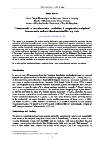 Kovács, Tímea (2025) Human-made vs. neural machine translation: A comparative analysis of human-made and machine-translated literary texts. PORTA LINGUA (1). pp. 5-13. ISSN 1785-2420