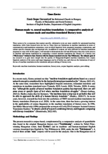 There seems to be a consensus that register-specific, informative texts are more suitable for automated machine translation, while form-focused texts are less so. Since there are limitations in machine translation in terms of communicative and translation competence, texts in which linguistic form, pragmatic meanings, connotations, and culture-specific elements play an important role, in addition to content, are more difficult for machine translation programs to cope with. In this paper, I will attempt to demonstrate the relevant differences that arise in the process of machine and human translation by comparing a neural machine translation (by DeepL) of a literary text (“Fatelessness” written by Imre Kertész) with the human translated text (by Tim Wilkinson). The ultimate goal of my research is to gain more insight into the quality of Hungarian–English machine translation, how corpus linguistic analysis of the source and target languages can be of further use, and what are the limitations (if any) of the use of machine translation in the translation and post-editing of literary texts.