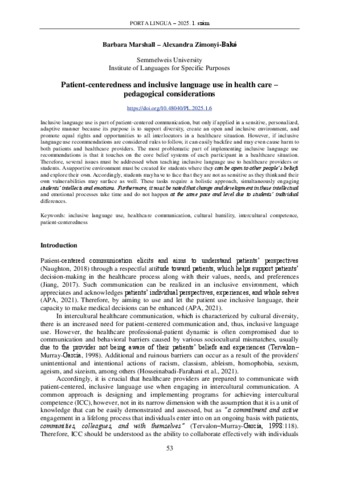Marshall, Barbara and Zimonyi-Bakó, Alexandra (2025) Patient-centeredness and inclusive language use in health care – pedagogical considerations. PORTA LINGUA (1). pp. 53-58. ISSN 1785-2420