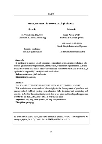 H. Tóth, István (2019) Mese, meseértés sokoldalú játékkal = Tale and Its Understanding with Multisided Playing. OXIPO : INTERDISZCIPLINÁRIS E-FOLYÓIRAT, 1 (3). pp. 73-82. ISSN 2676-8771