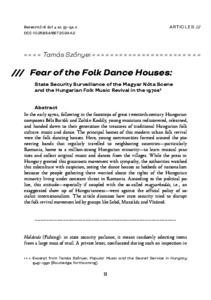Szőnyei, Tamás (2024) Fear of the Folk Dance Houses : State Security Surveillance of the Magyar Nóta Scene and the Hungarian Folk Music Revival in the 1970s. BETEKINTŐ, 18 (4). pp. 33-52. ISSN 2732-186X (print); 1788-7569 (online)