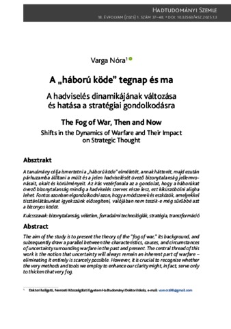 A tanulmány célja ismertetni a „háború köde” elméletét, annak hátterét, majd ezután párhuzamba állítani a múlt és a jelen hadviselését övező bizonytalanság jellemvonásait, okait és körülményeit. Az írás vezérfonala az a gondolat, hogy a háborúkat övező bizonytalanság mindig a hadviselés szerves része lesz, ezt kiküszöbölni aligha lehet. Fontos azonban elgondolkodni azon, hogy a módszerek és eszközök, amelyekkel tisztánlátásunkat igyekszünk elősegíteni, valójában nem teszik-e még sűrűbbé azt a bizonyos ködöt. | The aim of the study is to present the theory of the “fog of war,” its background, and subsequently draw a parallel between the characteristics, causes, and circumstances of uncertainty surrounding warfare in the past and present. The central thread of this work is the notion that uncertainty will always remain an inherent part of warfare – eliminating it entirely is scarcely possible. However, it is crucial to recognise whether the very methods and tools we employ to enhance our clarity might, in fact, serve only to thicken that very fog.