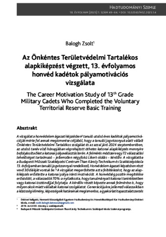 A vizsgálat a honvédelem ágazati képzésben tanuló utolsó éves kadétok pályamotivációját mérte fel annak megismerése céljából, hogy a tanulói jogviszonyuk alatt vállalt Önkéntes Területvédelmi Tartalékos szolgálat és az azzal járó 2024 szeptemberében, az utolsó tanév első hónapjában végrehajtott öt hetes katonai alapkiképzés mennyire befolyásolta őket a katonai pályaválasztás terén. A felmérés módszere egy 72 válaszadási lehetőséget tartalmazó – jellemzően négyfokú Likert-skálás – kérdőív. A vizsgálatba a Budapesti Műszaki Szakképzési Centrum Than Károly Technikum és Szakközépiskola 13. évfolyamban tanulói jogviszonnyal rendelkező, Honvédelem ágazati képzésben résztvevő 30 diákját vontuk be. A vizsgálat megerősítette azt a feltételezést, hogy az alapkiképzés erősítette a katonai pálya iránti motivációt. A honvédség pozitív megítélése erősödött, a válaszadók 70%-a nyilatkozta, hogy tanulmányait katonai tanintézetben vagy katonai ösztöndíjjal folytatja. A kérdőív részét képezte annak felmérése is, hogy milyen okok miatt vállaltak katonai szolgálatot. Generációjukra jellemző válaszaikban a közösségi élmény, képességeik határainak megismerése, a gyakorlati tapasztalatszerzés nagyobb súllyal szerepelt, mint az igért jövedelem. A mérés alapján feltételezhető, hogy a tartalékos szolgálat vállalásával, az érettségi utáni katonai pályaválasztás alternatívája felerősödik. A vizsgálat eredményeinek általános értelmezéséhez indokolt lehet a célcsoport számának növelése, több Honvéd Kadét Programban részt vevő intézmény bevonása. | The study assessed the career motivation of final-year cadets studying in the Defence sector training program to understand how their military career choices were influenced by their participation in the Voluntary Territorial Reserve service during their student status and the five-week basic military training conducted in September 2024, during the first month of their final academic year. The method of the survey was a questionnaire containing 72 response options, primarily using a four-point Likert scale. The study involved 30 students in the 13th grade enrolled in the Defence sector training program at the Than Károly Technical and Vocational Secondary School of the Budapest Technical Vocational Training Center. The study confirmed the assumption that the basic training enhanced motivation toward a military career. The positive perception of the Armed Forces improved, with 70% of respondents stating that they plan to continue their studies in a military educational institution or with a military scholarship. The questionnaire also included an assessment of the reasons for undertaking military service. In responses characteristic of their generation, greater emphasis was placed on the sense of community, exploring the limits of their abilities, and gaining practical experience, rather than the promised income. Based on the measurement, it can be assumed that undertaking reserve service strengthens the alternative of choosing a military career after graduation. To achieve a broader interpretation of the study’s results, it may be justified to increase the size of the target group and involve more institutions participating in the Military Cadet Program.