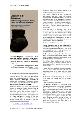 Richter, Éva (2024) Könyvismetetés : Lise Bender Jørgensen, Joanna Sofaer, Marie Louise Stig Sørensen: Creativity in the Bronze Age. Understanding Innovation in Pottery, Textile, and Metalwork Production. Cambridge, 2018, p. 342. ARCHEOMETRIAI MŰHELY, 21 (4). pp. 487-489. ISSN 1786-271X