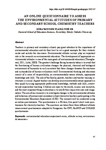 Vlaszátsné Vanczer, Dóra (2025) An online questionnaire to assess the environmental attitudes of primary and secondary school chemistry teachers. In: Komplex pedagógia : Válogatás a Pedagógiai Szakbizottság tagjainak a munkáiból Magyar Tudományos Akadémia Miskolci Területi Bizottság. Eszterházy Károly Katolikus Egyetem Líceum Kiadó, pp. 47-55.