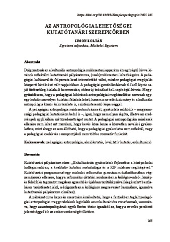 Dolgozatomban a kulturális antropológia módszertani apparátusát segítségül hívva kívánok reflektálni kutatótanári pályázatomra, (szak)módszertani lehetőségeire. A pedagógiai kultúraváltás folyamata kezd intenzívebbé válni, minden pedagógiai megújulás központi kérdésévé vált napjainkban. A pedagógiai gondolkodásnak túl kell lépnie saját történetileg kialakult konvencióin, ehhez új teóriákat kell segítségül hívnia. Megy győződésem, hogy a pedagógiai kihívások antropológiai megközelítése nemcsak egy egy kutató személyes kutatási feladata lehet, hanem a neveléstudomány és a kulturális antropológia közös kulcsterülete is, szintézisteremtő képességgel. A pedagógiai antropológia módszertani bázisa él, gyakorlata működik – magyarországi pedagógiai kutatásokon belül is –, igaz, hogy nem olyan régóta, illetve az ered mények applikálása széttöredezettséget mutat. A pedagógiai antropológiára mindezek ellenére nem lehet azt mondani, hogy kevés köze lenne a közvetlen nevelési gyakorlathoz, mint ahogy az sem állítható, hogy a pedagógiai gyakorlatra nem reflektál, vagy a pedagógiai cselekvés szempontjából nem tölt be normatív funkciót.
