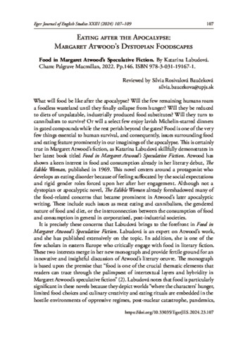 Baučeková, Silvia Rosivalová (2024) Eating after the Apocalypse: Margaret Atwood’s Dystopian Foodscapes. EGER JOURNAL OF ENGLISH STUDIES, 23. pp. 107-109. ISSN 1786-5638 (print); 2060-9159 (online)