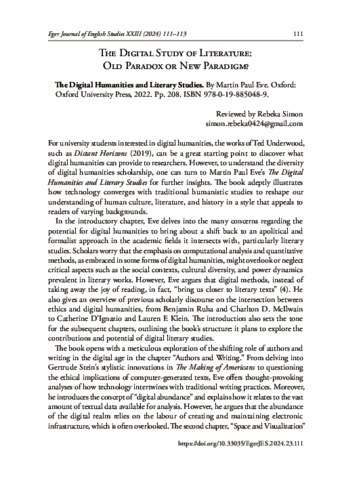 Simon, Rebeka (2024) The Digital Study of Literature: Old Paradox or New Paradigm? EGER JOURNAL OF ENGLISH STUDIES, 23. pp. 111-113. ISSN 1786-5638 (print); 2060-9159 (online)