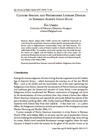 Urbán, Éva (2024) Culture-Specific and Postmodern Literary Devices in Sherman Alexie’s Indian Killer. EGER JOURNAL OF ENGLISH STUDIES, 24. pp. 71-88. ISSN 1786-5638 (print); 2060-9159 (online)