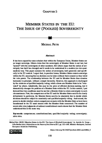 Petr, Michal (2025) Member States in the EU: The Issue of (Pooled) Sovereignty. In: Federalism as the Future of the Diverse EU? Studies of the Central European Professors’ Network . Central European Academic Publishing, Miskolc - Budapest, pp. 155-186.