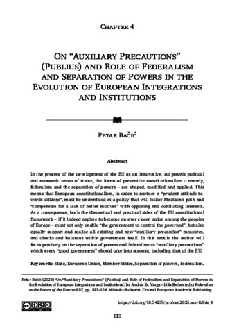 Bačić, Petar (2025) On “Auxiliary Precautions” (Publius) and Role of Federalism and Separation of Powers in the Evolution of European Integrations and Institutions. In: Federalism as the Future of the Diverse EU? Studies of the Central European Professors’ Network . Central European Academic Publishing, Miskolc - Budapest, pp. 113-154.