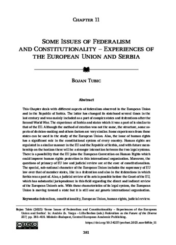 Tubic, Bojan (2025) Some Issues of Federalism and Constitutionality – Experiences of the European Union and Serbia. In: Federalism as the Future of the Diverse EU? Studies of the Central European Professors’ Network . Central European Academic Publishing, Miskolc - Budapest, pp. 381-418.