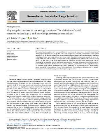 LaBelle, M.C. and Szép, Tekla and Tóth, Géza (2025) Why Neighbors Matter in the Energy Transition: The diffusion of social practices, technologies, and knowledge between municipalities. RENEWABLE AND SUSTAINABLE ENERGY TRANSITION, 7. No.-100109. ISSN 2667-095X
