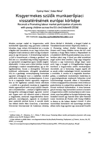 Eplényi, Kata and Szász, Réka (2025) Kisgyermekes szülők munkaerőpiaci visszatérésének európai körképe : Recenzió a Promoting labour market participation of parents with young children across the EU című kötetről (2024). KAPOCS, 8 (1-2). pp. 179-182. ISSN 1588-7227