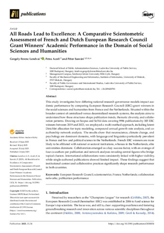 Lendvai, Gergely Ferenc and Petra, Aczél and Sasvári, Péter László (2025) All Roads Lead to Excellence: A Comparative Scientometric Assessment of French and Dutch European Research Council Grant Winners’ Academic Performance in the Domain of Social Sciences and Humanities. PUBLICATIONS, 13 (34). ISSN 2304-6775