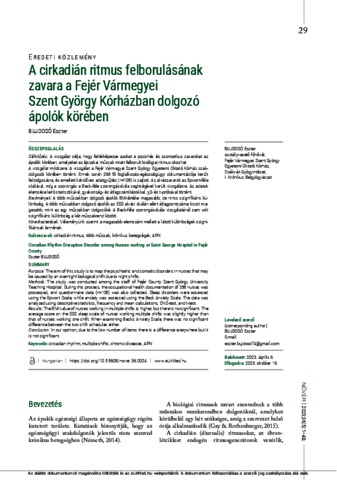 Bujdosó, Eszter (2023) A cirkadián ritmus felborulásának zavara a Fejér Vármegyei Szent György Kórházban dolgozó ápolók körében = Circadian Rhythm Disruption Disorder among Nurses working at Saint George Hospital in Fejér County. NŐVÉR, 36 (5). pp. 29-35. ISSN 0864-7003 (print); 1588-1423 (online)