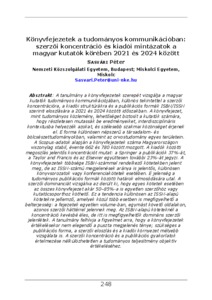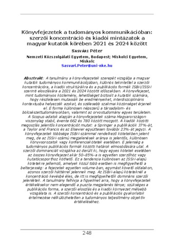 Sasvári, Péter László (2025) Könyvfejezetek a tudományos kommunikációban: szerzői koncentráció és kiadói mintázatok a magyar kutatók körében 2021 és 2024 között. In: Studies on Human and Social Problems. Sozial und Wirtschafts Forschungsgruppe; International Research Institute, Grosspetersdorf, Marcelová, pp. 248-263. ISBN 9783903317185
