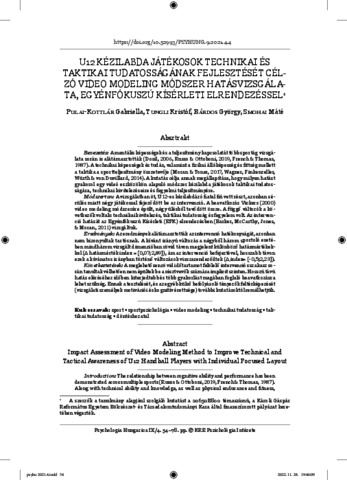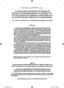 Bevezetés: A mentális képességek és a teljesítmény kapcsolatát több sportág vizsgálata során is alátámasztották (Dosil, 2006, Russo & Ottoboni, 2019, French & Thomas, 1987). A technikai képességek és tudás, valamint a fizikai állóképesség és fittség mellett a taktika a sportteljesítmény összetevője (Moran & Toner, 2017, Wagner, Finkenzeller, Würth & von Duvillard, 2014). A kutatás célja annak megállapítása, hogy milyen hatást gyakorol egy videó eszközökön alapuló módszer kézilabda játékosok taktikai tudatosságára, technikai kivitelezéseire és fegyelmi teljesítményére. Módszertan: A vizsgálatban öt, U12-es kézilabdázó fiatal fiú vett részt, azonban sérülés miatt négy játékossal fejeződött be az intervenció. A beavatkozás Vickers (2000) video modeling módszerére épült, négy ülésből tevődött össze. A függő változók a következők voltak: technikai kivitelezés, taktikai tudatosság és fegyelem volt. Az intervenció hatását az Egyénfókuszú Kísérleti (EFK) elrendezésben (Barker, McCarthy, Jones, & Moran, 2011) vizsgáltuk. Eredmények: Az eredmények alátámasztották az intervenció hatékonyságát, azonban nem bizonyultak tartósnak. A kívánt irányú változás a négyből három sportoló esetében mindhárom vizsgált dimenzióban rövid távon megjelent különböző hatásmértékekkel (∆ hatásmérték index = [0,07;2,89]), ám az intervenció befejeztével, hosszabb távon ezek a kívánatos irányban történő változások visszarendeződtek (∆- index= [-0,5;2,23]). Következtetések: A meglehetősen rövid időtartamot felölelő intervenciós szakasz során tanultak vélhetően nem épültek be a résztvevők számára implicit szinten. Hosszú távú hatás eléréséhez időben kiterjedtebb és több gyakorlást magában foglaló beavatkozásra lehet szükség. Ennek a tesztelését, és az egyéb külső befolyásoló tényezők feltérképezését (vizsgálati személyek motivációi és kognitív érettsége) további kutatásoktól remélhetjük. | Introduction: The relationship between cognitive ability and performance has been demonstrated across multiple sports (Russo & Ottoboni, 2019, French & Thomas, 1987). Along with technical ability and knowledge, as well as physical endurance and fitness, tactics are a major factor in success in sport. (Wagner, Finkenzeller, Würth & von Duvillard, 2014). The aim of the research is to determine the impact of a video-based method on tactical awareness, technical execution and disciplinary performance of handball players. Methodology: Five U12 handball player boys participated in the study, but only four players completed the intervention due to an injury. The intervention was based on Vickers (2000) video modeling method and consisted of four sessions. The dependent variables were technical execution, tactical awareness and discipline. The effect of the intervention was examined (Barker, McCarthy, Jones, & Moran, 2011) in the Individual Focused Experimental (EFC) layout. Results: The results supported the effectiveness of the intervention but were temporary only and not sustained. Changes were made in the desired direction in case of three out of the four athletes where effects appeared in the short term in each of the three dimensions studied (∆ effectsize = [0.07; 2.89]), however these changes were reversed in the longer term after the intervention (∆-index= [-0,5;2,23]). Conclusions: During the relatively short intervention phase with the participants the effects did not get e embedded at the implicit level. Long-term impact may require more extensive and lengthy training, interventions. Testing this and mapping of other external influencing factors (subject motivation and cognitive maturity) are expected from further research.