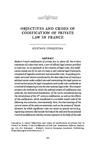 Cerqueira, Gustavo (2024) Objectives and crises of codification of private law in France. In: Codification of Civil Law: Assessment, Reforms, Options. Legal Heritage . Central European Academic Publishing, Miskolc–Budapest, pp. 139-179. ISBN 978-615-6474-72-8 ISBN (epub) 978-615-6474-73-5 ISBN (pdf) 978-615-6474-74-2