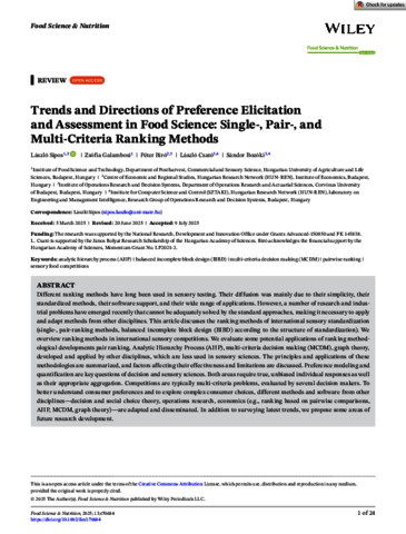 Sipos, László and Galambosi, Zsófia and Biró, Péter and Csató, László and Bozóki, Sándor (2025) Trends and Directions of Preference Elicitation and Assessment in Food Science : Single‐, Pair‐, and Multi‐Criteria Ranking Methods. FOOD SCIENCE AND NUTRITON, 13 (8). No.-e70684. ISSN 2048-7177