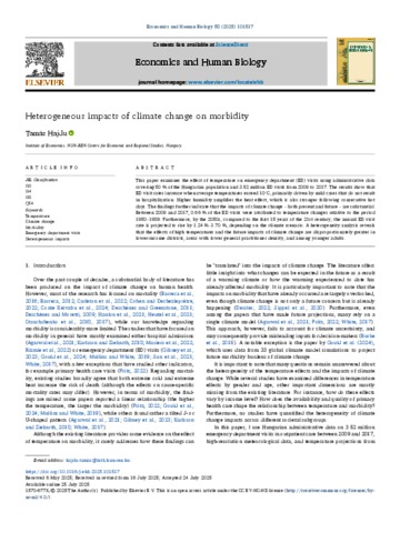 Hajdu, Tamás (2025) Heterogeneous impacts of climate change on morbidity. ECONOMICS AND HUMAN BIOLOGY, 58. No.-101517. ISSN 1570-677X