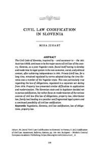 Juhart, Miha (2024) Civil Law Codification in Slovenia. In: Codification of Civil Law: Assessment, Reforms, Options. Legal Heritage . Central European Academic Publishing, Miskolc–Budapest, pp. 339-366. ISBN 978-615-6474-72-8 ISBN (epub) 978-615-6474-73-5 ISBN (pdf) 978-615-6474-74-2