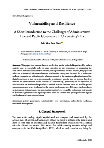 Vilas Boas Pinto, João (2024) Vulnerability and Resilience : A Short Introduction to the Challenges of Administrative Law and Public Governance in Uncertainty’s Era. PUBLIC GOVERNANCE ADMINISTRATION AND FINANCES LAW REVIEW, 9 (2). pp. 1-16. ISSN 2498-6275 (nyomtatott); 2786-0736 (online)