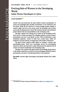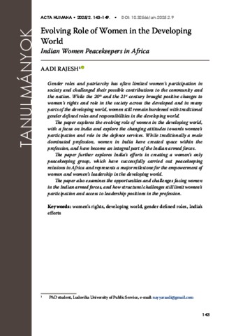 Aadi, Rajesh (2025) Evolving Role of Women in the Developing World : Indian Women Peacekeepers in Africa. ACTA HUMANA: HUNGARIAN CENTRE FOR HUMAN RIGHTS PUBLICATIONS, 13 (2). pp. 143-149. ISSN 0866-6628